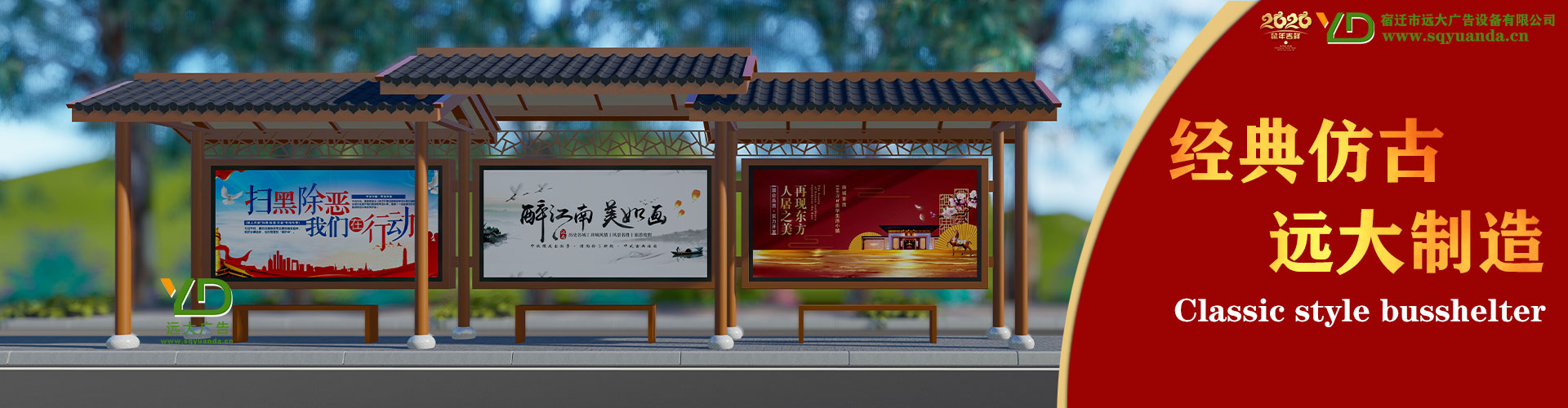 宿遷市遠大廣告設備有限公司是一家專業生產公交候車亭,公交站臺,閱報欄,指路牌,廣告垃圾箱,滾動換 畫燈箱等系列產品廠家!產品多達上百種,亦可根據客戶的需求加工制作。